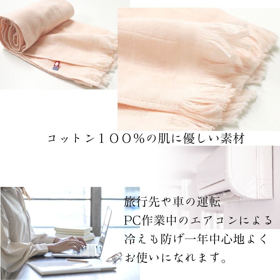 コットン100%の肌に優しい素材は、旅行先や車の運転、PC作業中のエアコンによる冷えも防げ、一年中心地よくお使いになれます。