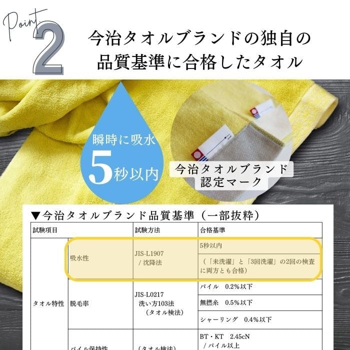 独自の品質基準をクリアしたタオルだけが名乗ることのできる「今治タオルブランド認定商品」で、 触れるだけでさっと水分を吸い取ってくれる高い吸水性を、使い始めから感じていただくことができます。